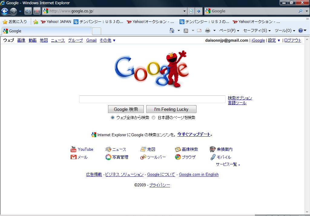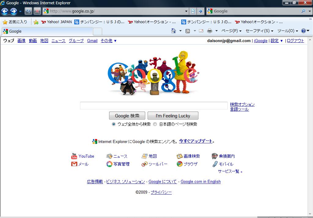 さて、少し前に、グーグルのページのロゴがセサミストリート40周年カウントダウン記念ロゴに日替わりでキャラクターがコラボしていたという記事をお伝えしました。 (以前の詳細記事はコチラ:おぉ!パート3 、おぉ!2 、おぉ! ) で、その後はUSJのネタが続いたのでしばらく放置でしたが、ついに本日40周年を迎えました!!おめでとうです!! さて、では、11/7以降の変遷をざっくりたどります。 11/7 ▲なんとオスカーが登場。さすがネガティブキャラクター。 テンションが下がってしまい…ページ全体のファイルを作り忘れてしまいました(苦笑) 11/8 ▲われらがエルモ登場です!! いやぁ、なんともかわいらしくコラボですねぇ。 11/9 ▲さすがカウント伯爵。全部数字でグーグルを表現! これはいいですなぁ。グッドデザイン賞? 11/10 ▲オールキャラクター登場です! 40周年おめでとう! ぜひ http://www.google.co.jp/ ▲こちらのアドレスにてご確認ください!! それにしても、キャラクターは個性豊かですよねぇ。 さて。今後のインパーク予定ですが、11/20、21、24を予定しています。 ただ…11/14も行きたいなぁとは思っているのですが…男子大学生が1人で…年賀状スタジオに行っていいのかというちょっと不安というか…なんというか…悩みどころです(苦笑) それでは、みなさんまた明日。 明日、明後日中には、9000HITいけそうですね。 9000HITの方には画面上でポップがでますので、そちらにぜひご記入ください。 PR