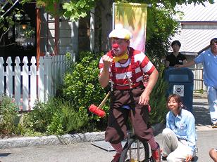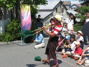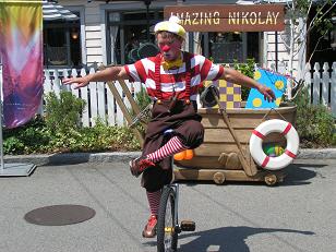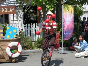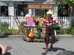 さて、8/31のアメージング・ニコライ行ってみましょう(^^)v アメージング・ニコライとは、アミティ・ビレッジというエリアで、1日に数回行われていたショーです。 8/31をもって終了してしましました。 僕自身も、最初から最後まできっちりと見たのは、8/31が初めてでしたが、わくわく・元気がでるようなショーでした。 まずは、銀の金属ボールを使った見せ物です。 これがまた、体にくっついている、かのように見えるので不思議でした。 夏は汗をかくので、こまめにフキフキしてるようすもとってもチャーミングでしたね。 これは、漁村と言うことで、魚の網に棒がついたものを使ったものです。 これには、選ばれたゲストが、簡単にアレンジされた内容にチャレンジするといった心意気もあり、ゲストとニコライさんが一体となって楽しめました。 ↑はトランペットの音色にあわせて、まるで演奏しているかのように見せてるわけです(^^)これ、僕的にツボでした。 一輪車に乗りながら(アイドリング)お手玉です。 とっても上手でしたよ。(さすがアメージング=驚異的なことはありますね) ↑これが元気になるかけ声です(苦笑) ニコライさんは技を決めるために「イエス」というのです(^^) ですが、単に言うだけではなく「イエッス」と小さくガッツポーズしながら言うので、だんだん効いてきます。そしてそのうち虜になります。 だって、1回のショーで、十数回言いますからね。 一輪車を器用に乗りこなし、そのうち、ペダルを使わないで乗り始めました。 じつは、一輪車に乗りながら、足でボールをすくい上げ、かごに入れるというすごい技があります。 さらに、もう一回ゲストと一緒になってキャッチボールをするくだりがあります。 ですが、僕はビデオに夢中で写真がありません(^^;) そして、 終演。ニコライさんはいつもどおり、ショーエリアの区切りのロープをかたづけて帰られていきました。 P.S. 実は、この後のユニバーサル・ウォーター・パレードのウェット・ゾーンの案内役に出演されてたようです。 |